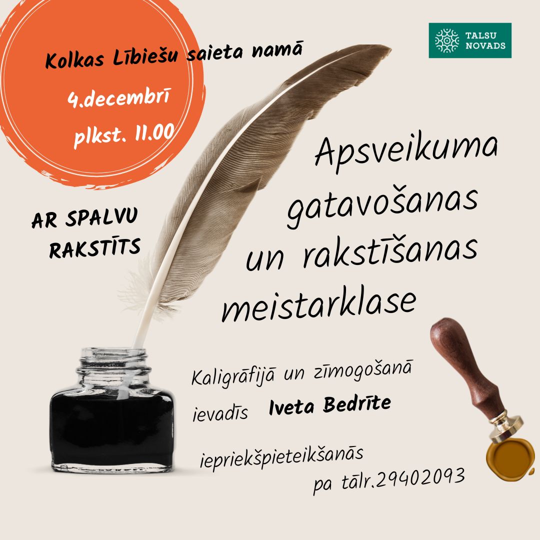 Zie­massvēt­kus un Gadu miju gai­dot, 4. decembrī plkst. 11. 00 Kol­kas Lībie­šu saie­ta namā Ive­ta Bed­rī­te iepa­zīs­ti­nās ar kalig­rā­fi­ju un zīmogošanu!