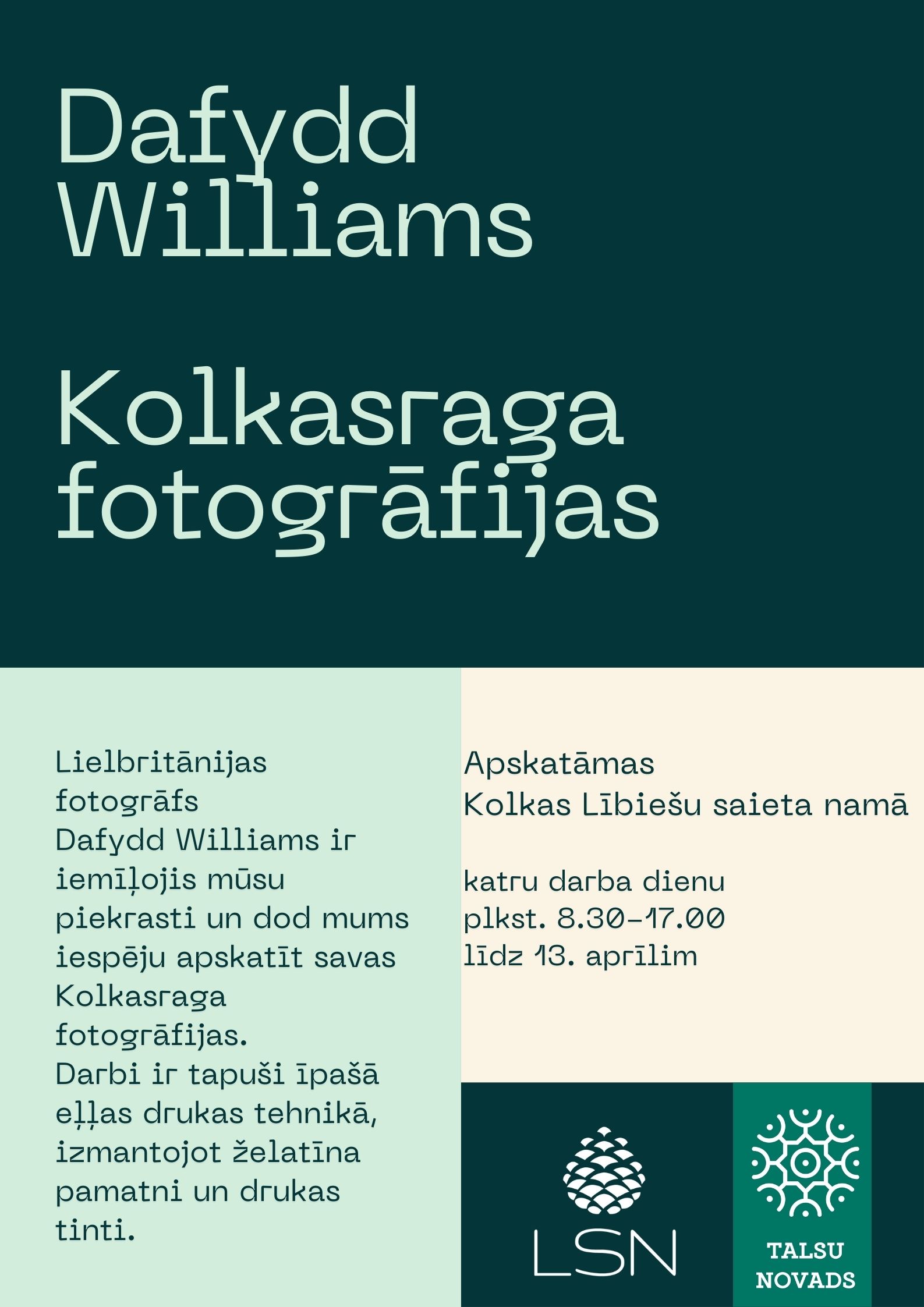 Kol­ka vētrā ir izdru­ku sēri­ja, ko es izvei­do­ju pēc sava nese­nā brau­cie­na uz Kolku. Es te esmu bijis vai­rāk­kārt, bet šis brau­ciens 2020. gada feb­ruā­rī ir vis­vai­rāk pali­cis prā­tā né tikai tāpēc, ka bija tie­ši pirms star­ptau­tis­kie ceļo­ju­mi tika pār­trauk­ti pan­dē­mi­jas dēļ, bet arī tāpēc, ka tā bija pir­mā rei­ze, kad pie­dzī­vo­ju vēt­ru pie­kras­tē. Biju vēja, lie­tus un jūras šļak­stu apdau­zīts, to es nekad neaiz­mir­sī­šu. Pēc atgrie­ša­nās Velsā un uzņem­to fotog­rā­fi­ju attīs­tī­ša­nas es biju pār­steigts, cik neasas un dre­be­lī­gas tās bija. Bet, ska­to­ties pēc lai­ka, sapra­tu, ka attē­li bija notvē­ru­ši vēt­ras atmos­fē­ru un tās sajū­tas, kas man bija, stā­vot lie­tū meža malā, ska­to­ties, kā to noska­lo. Tas ir vai­rāk nekā jeb­ku­ra fotog­rā­fi­ja, kuru jeb­kad esmu uzņē­mis,’’ stās­ta Dafydd.